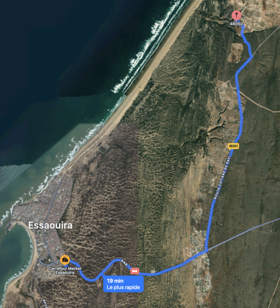 Leave Essaouira after the Carrefour supermarket on the RN8 towards Marrakech.